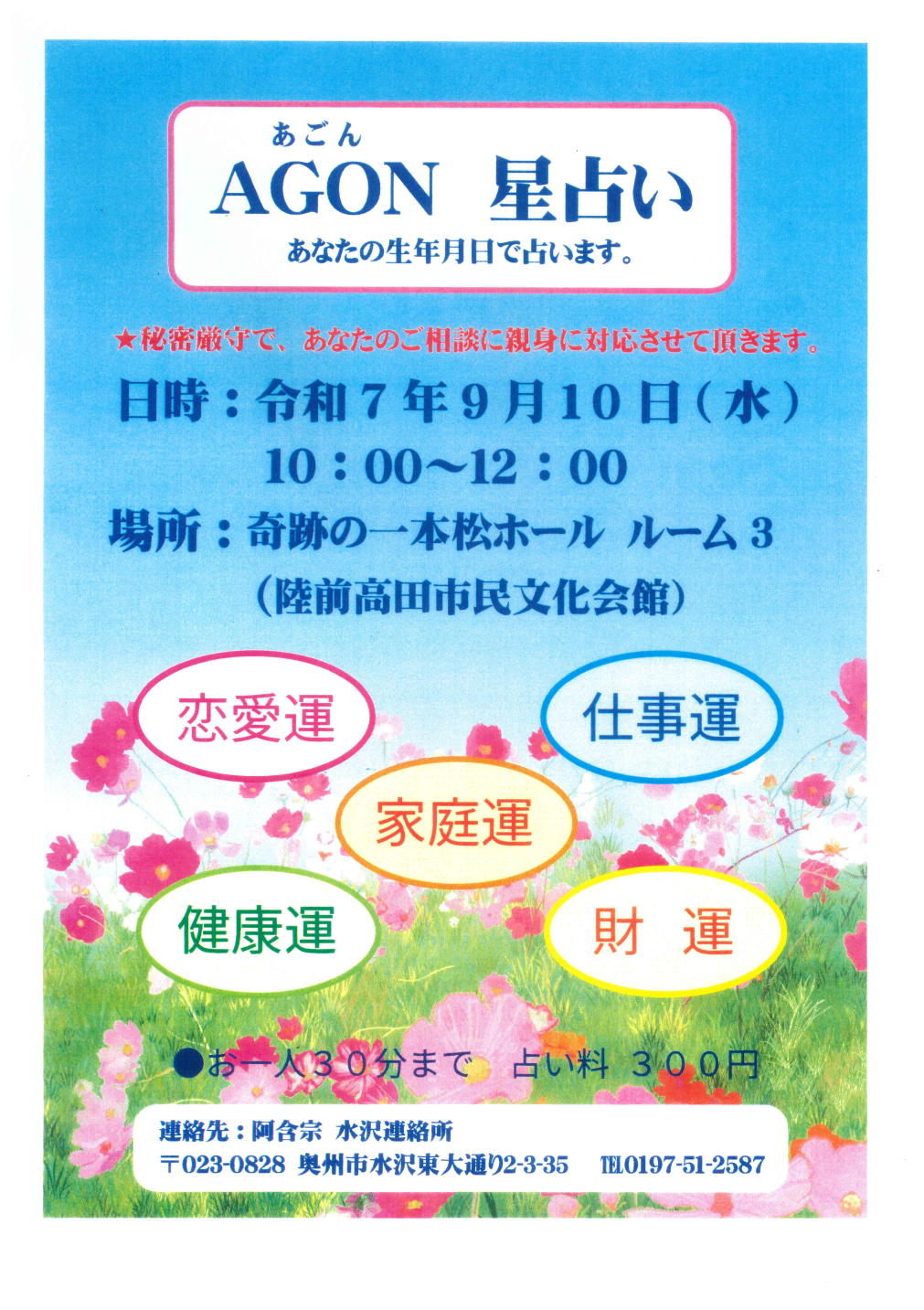 > 【9月10日】AGON星占い(阿含宗水沢連絡所)が開催されます。