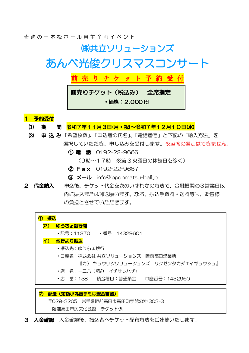 12/21開催の自主企画イベント「あんべ光俊クリスマスコンサート」の電話等予約