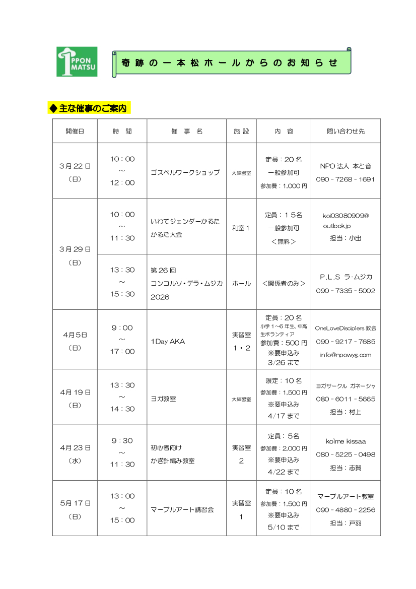 奇跡の一本松ホール催事のご案内(4月分)
