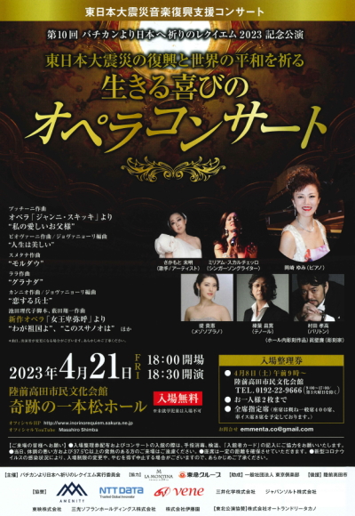 > 【4月21日開催】東日本大震災音楽復興支援コンサート「生きる喜びのオペラコンサート」が開催されます。