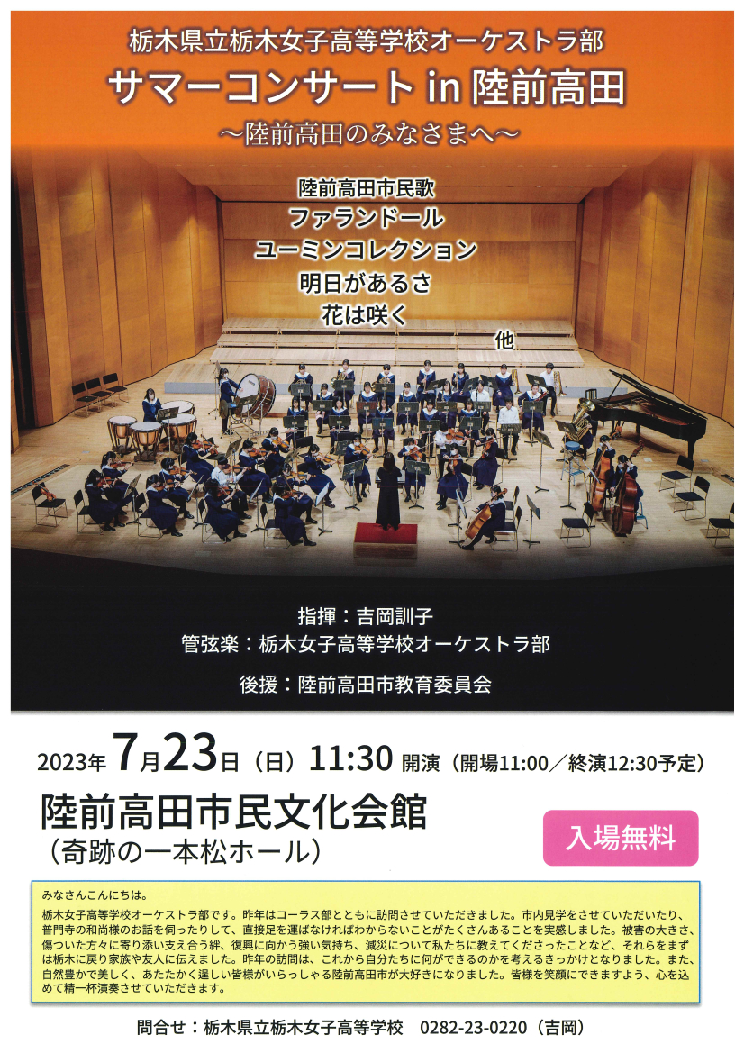 > 【7月23日開催】栃木女子高等学校オーケストラ部「サマーコンサート」が開催されます。