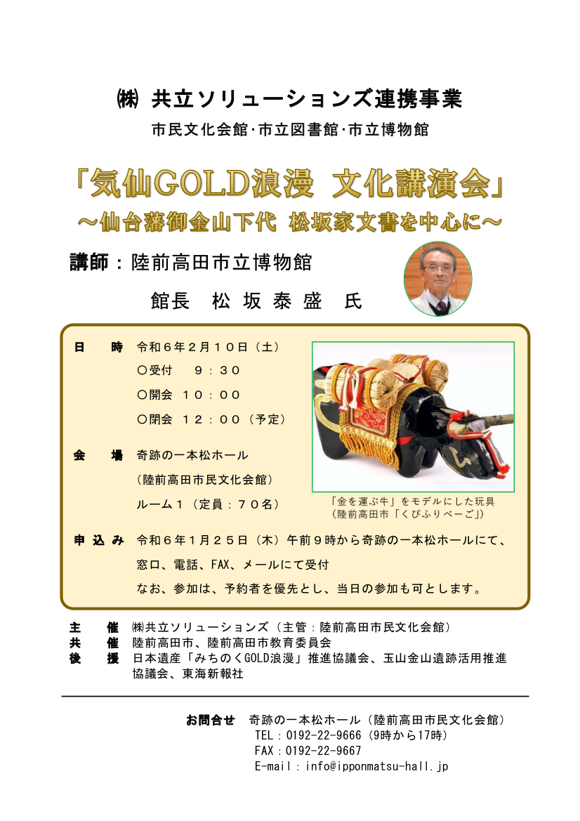 > 【2月10日開催】「㈱共立ソリューションズ連携事業 気仙GOLD浪漫 文化講演会」が開催されます。