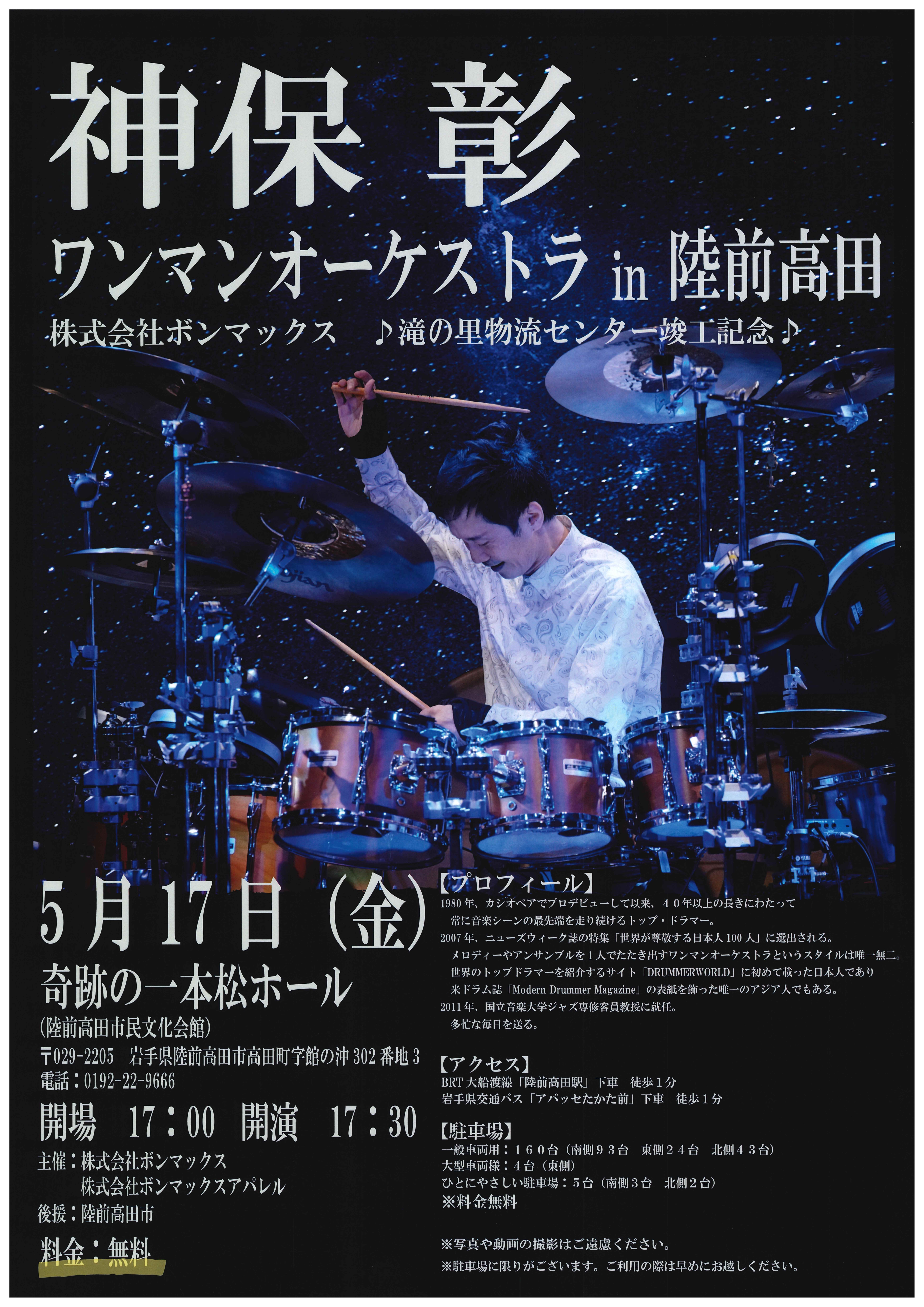 【5月17日開催】「神保彰ワンマンオーケストラin陸前高田」が開催されます。