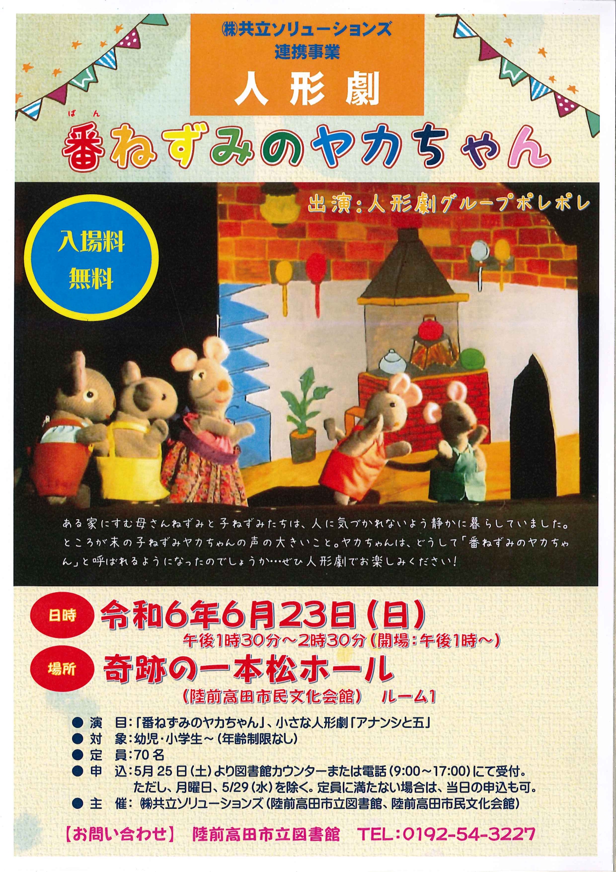 > 【6月23日開催】「㈱共立ソリューションズ連携事業 人形劇 番ねずみのヤカちゃん」が開催されます。