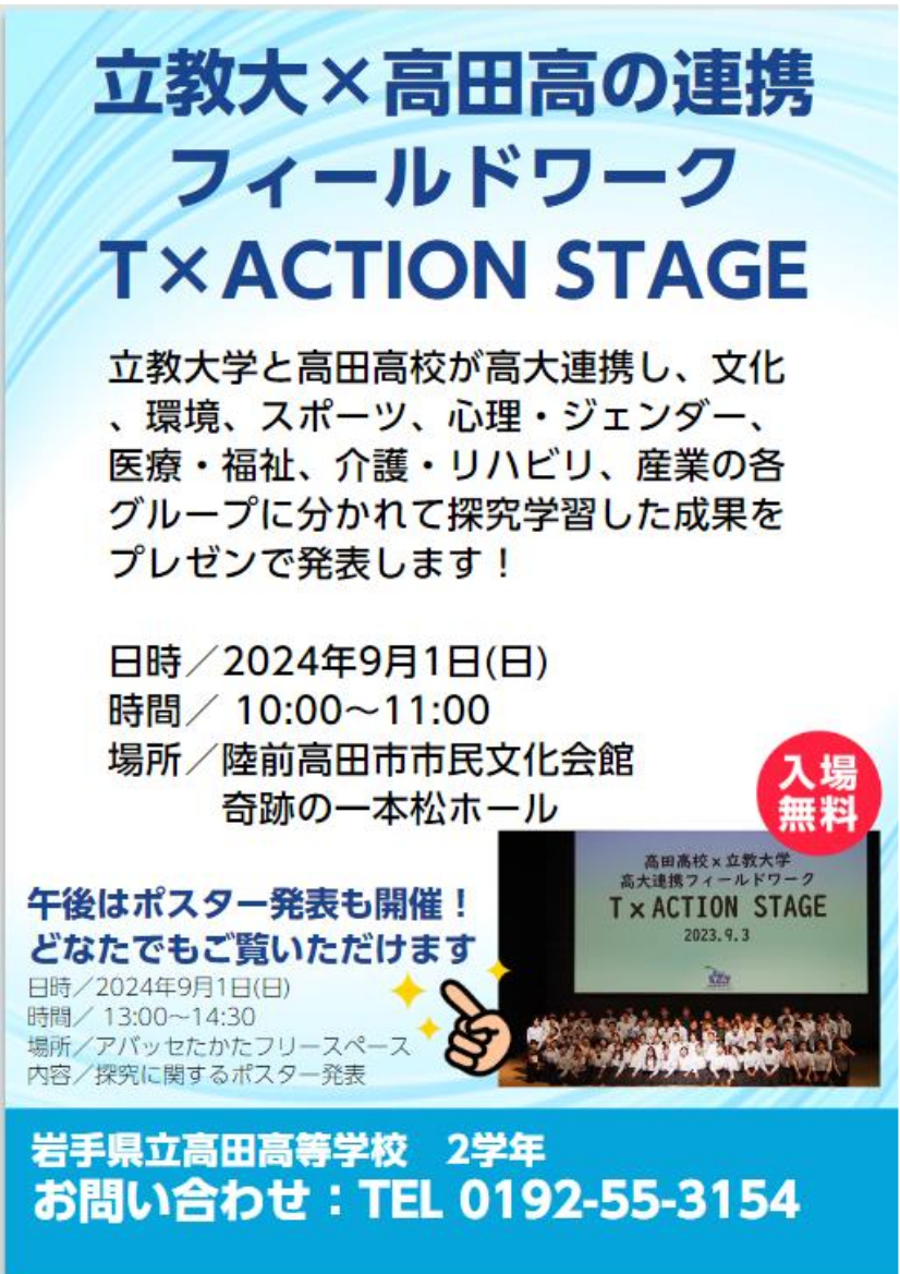 > 【9月1日開催】「立教大×高田高の連携 フィールドワーク T×ACTION STAGE」が開催されます。