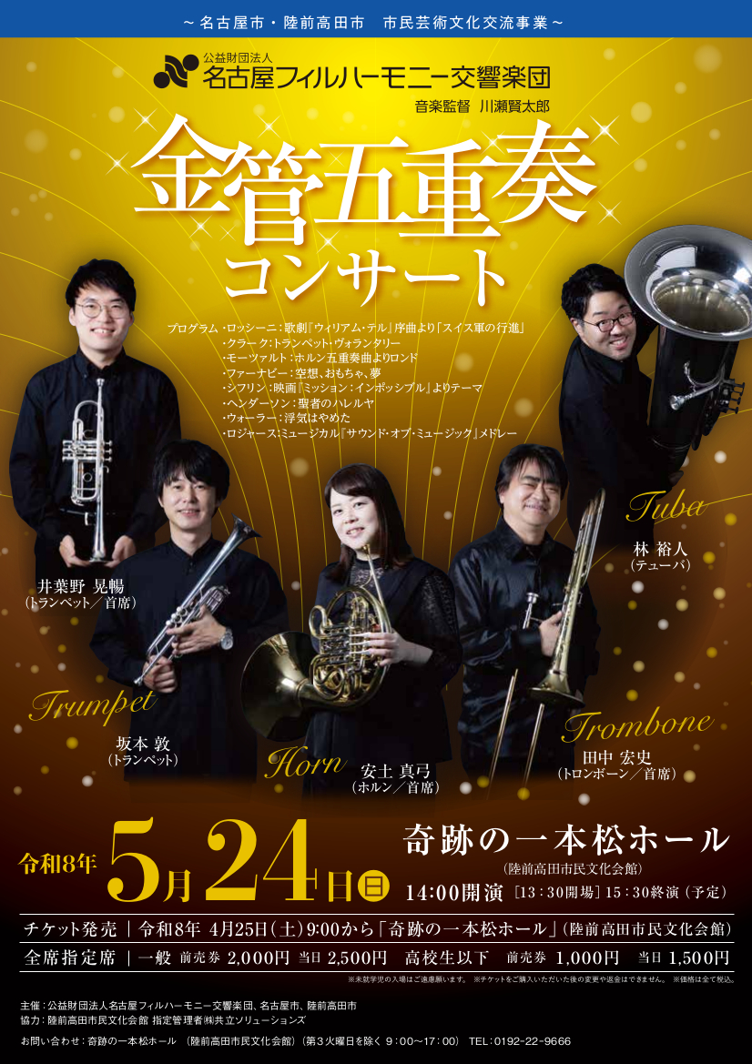 > 【5月24日】~名古屋市 陸前高田市 市民芸術文化交流事業~名古屋フィルハーモニー交響楽団 金管五重奏コンサートが開催されます。