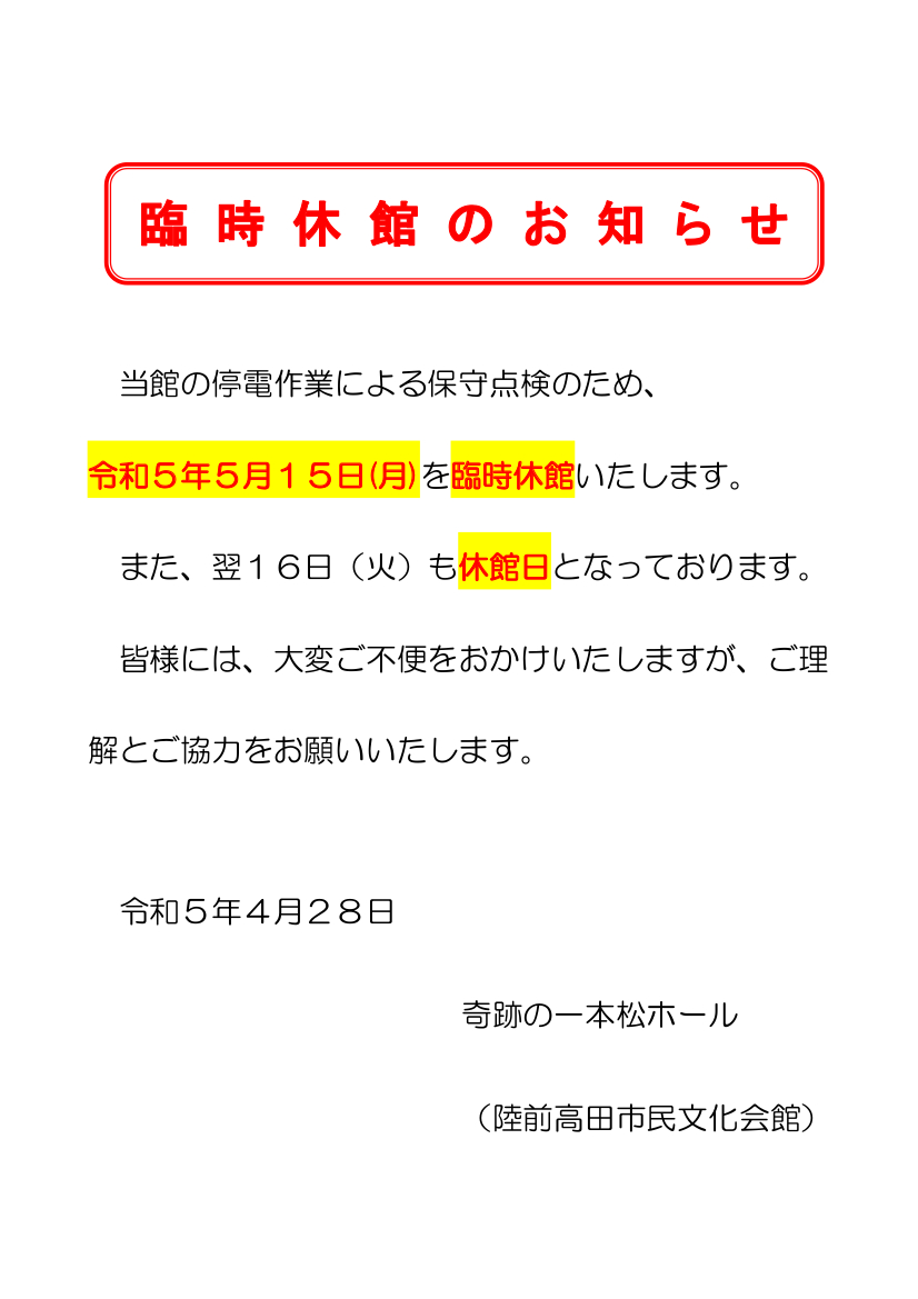 【令和5年5月15日(月)】臨時休館のお知らせ