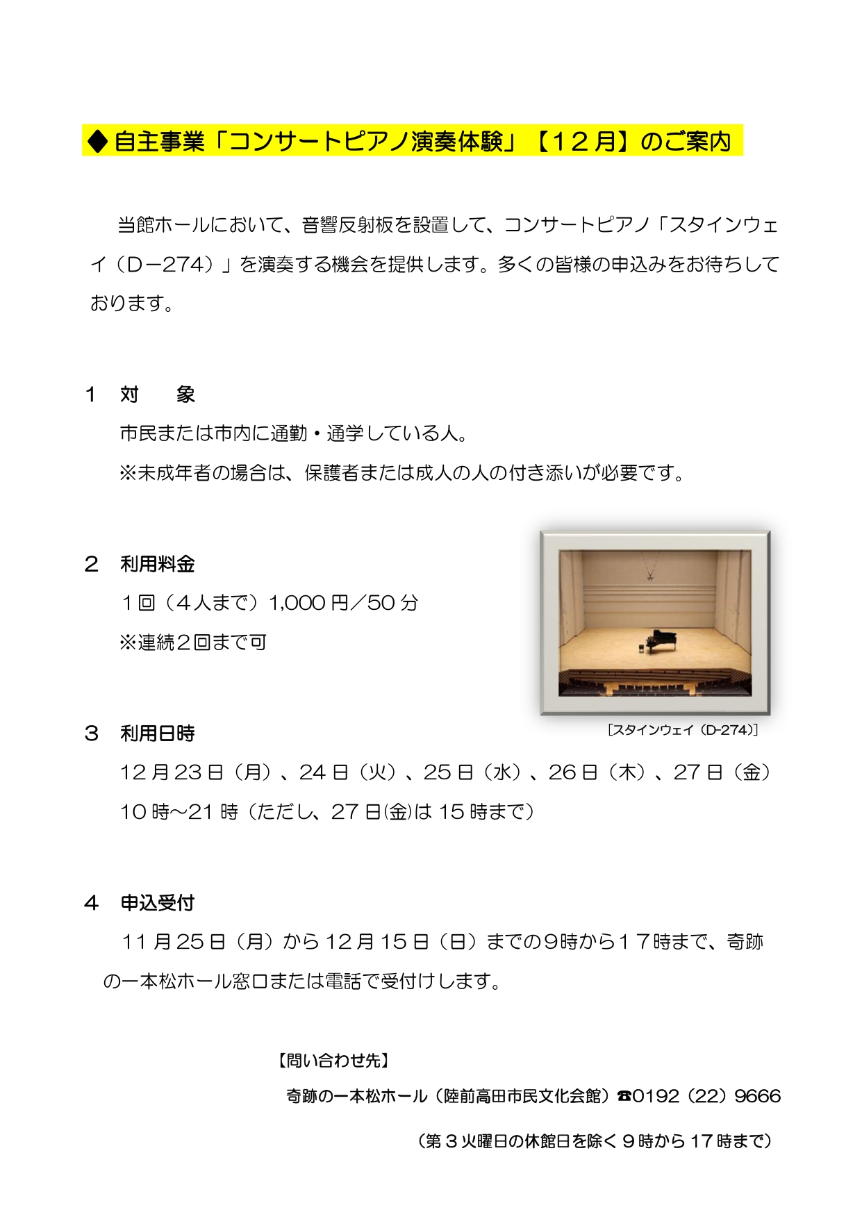 自主事業「コンサートピアノ演奏体験」のご案内(12月分)
