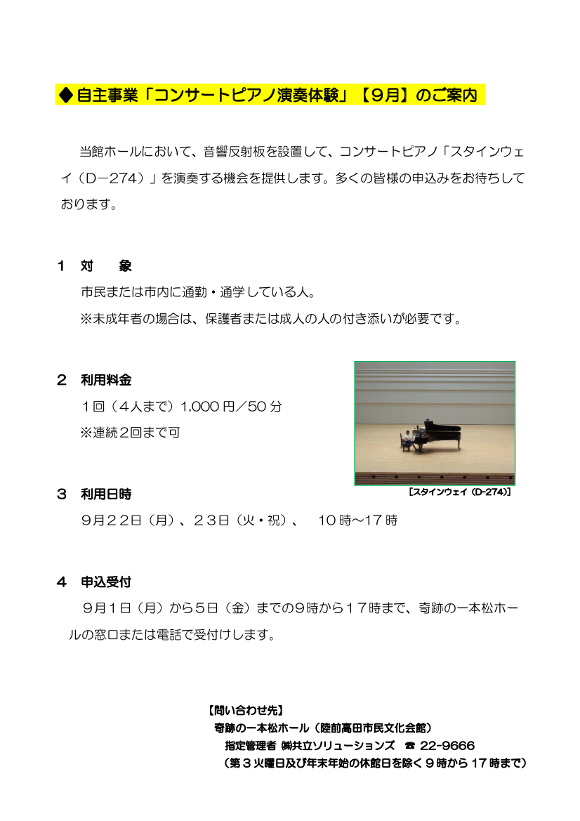 自主事業「コンサートピアノ演奏体験」のご案内(9月分)