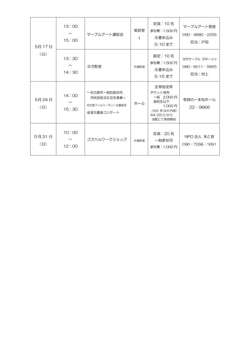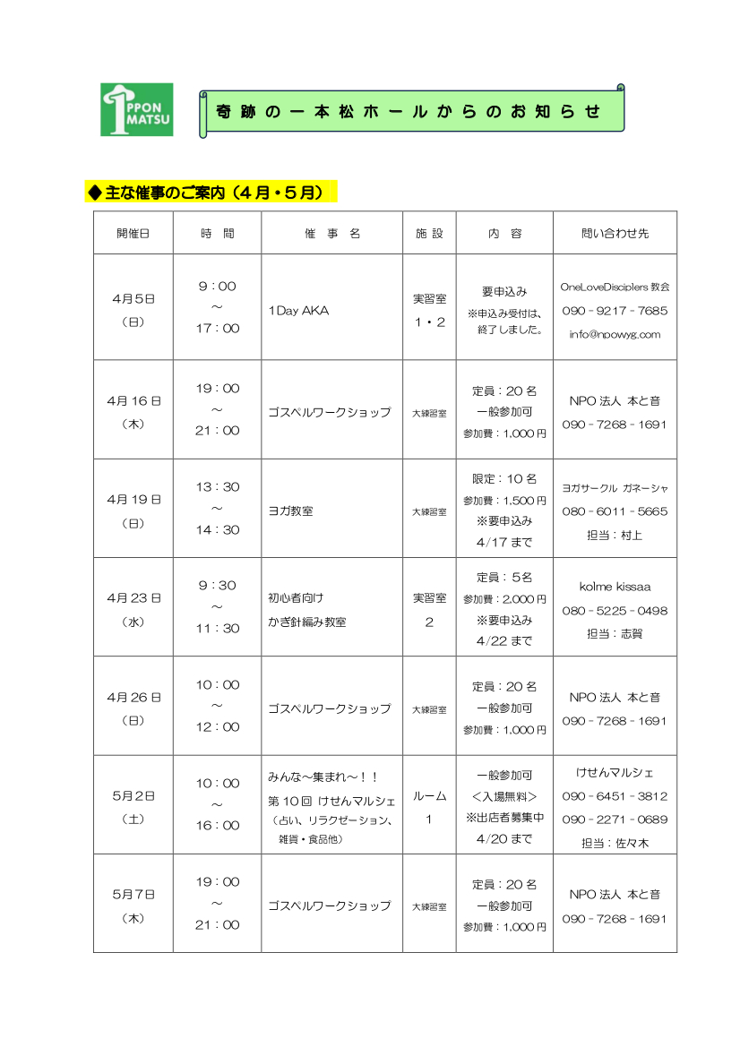 奇跡の一本松ホール催事のご案内(4月分)